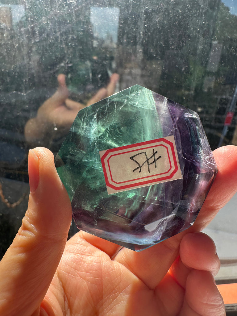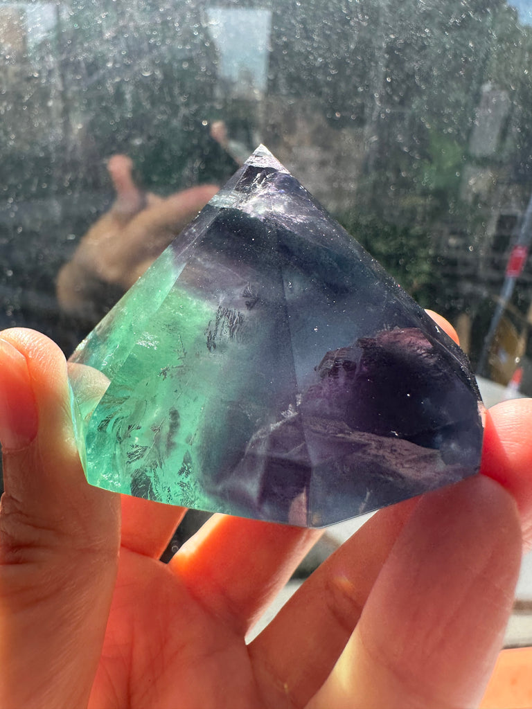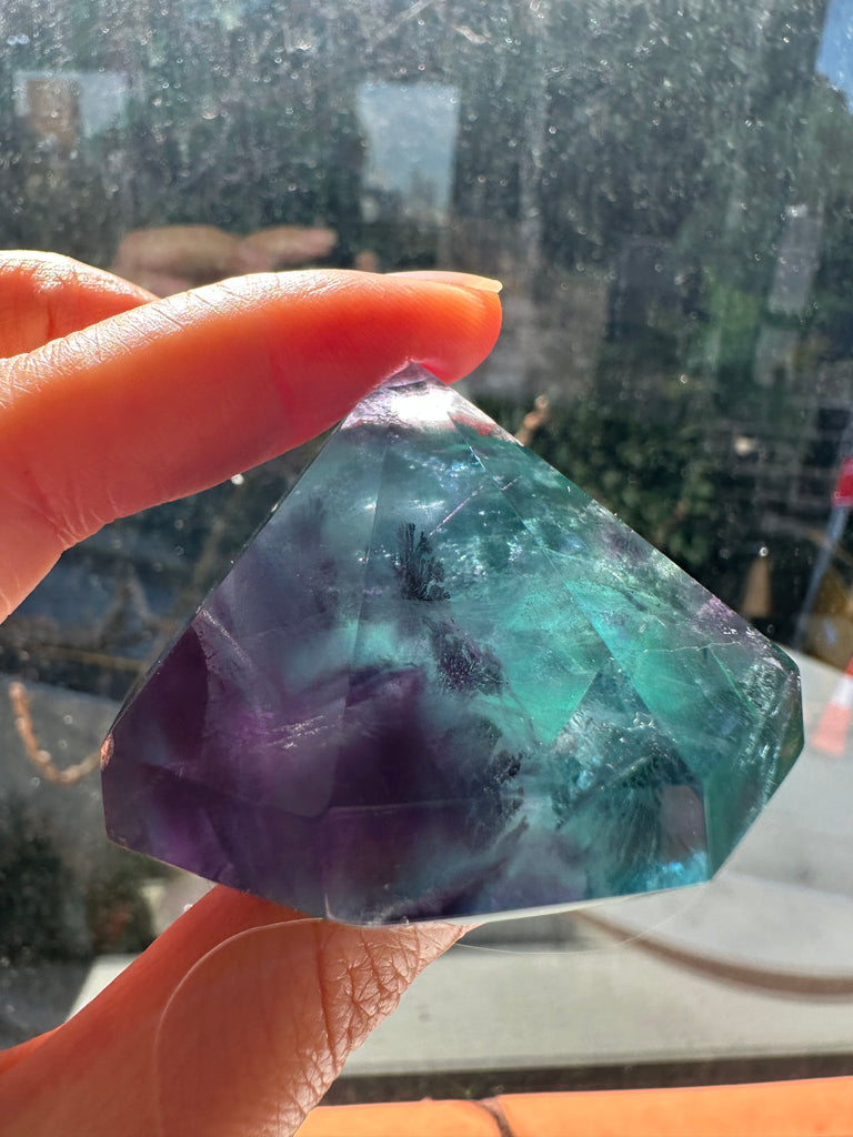 This Rare Fluorite Diamond-Shaped Carving is a true gem — both energetically and visually. Hand-carved from natural fluorite with stunning bands of green, purple, and blue, its unique geometric diamond shape is not only rare to find, but also amplifies energy in all directions with refined focus.