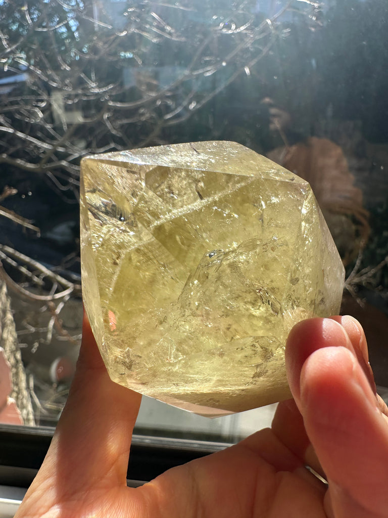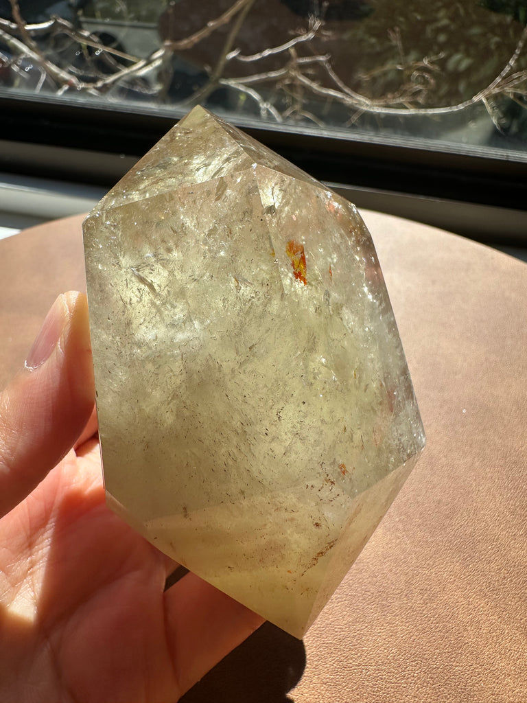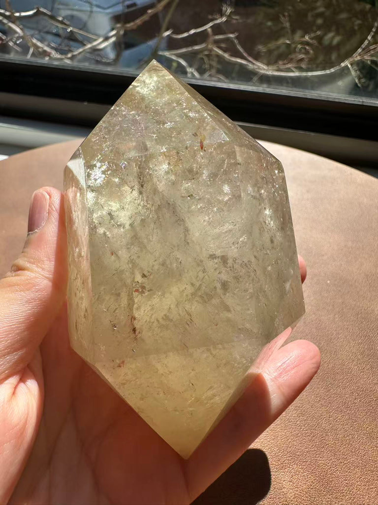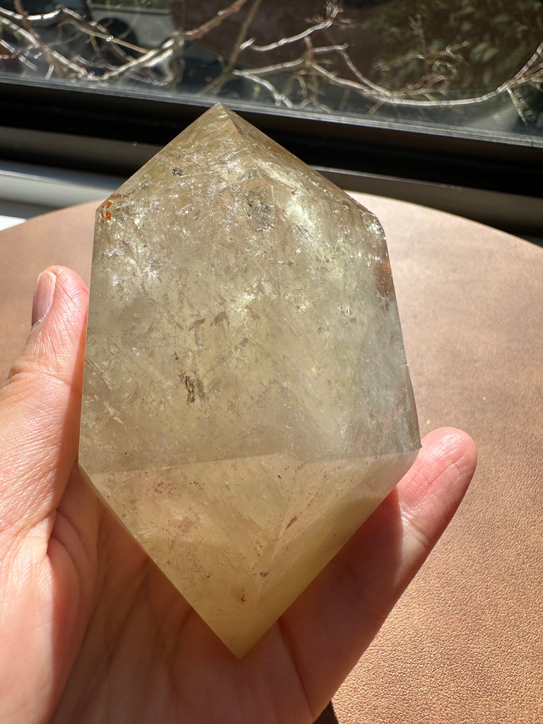 This stunning high-quality Citrine double terminated point weighs 167g and features beautiful rainbow inclusions, making it not only a powerful energy tool but also a visually captivating piece for your space.