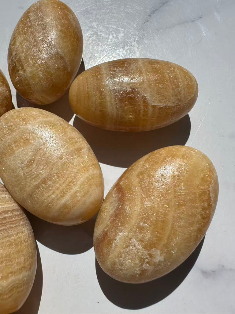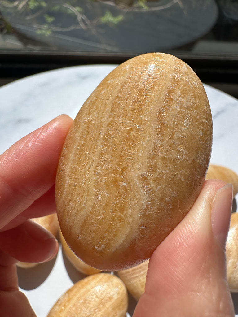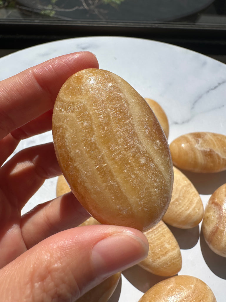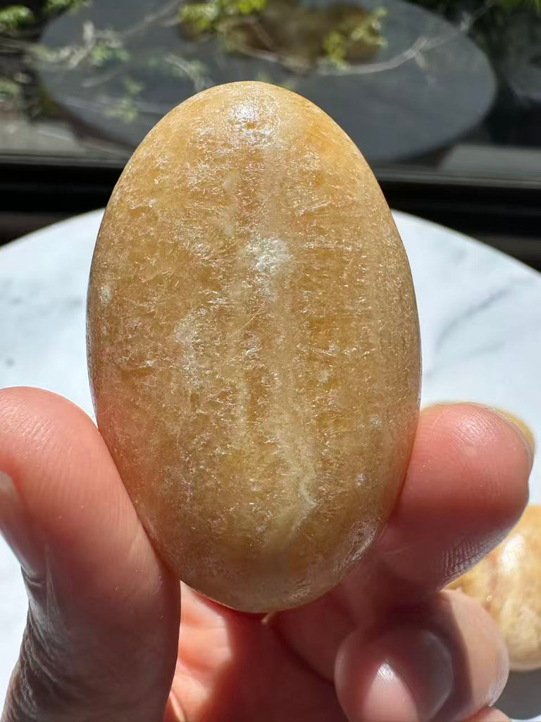 Natural Yellow Calcite — no dye, no coating; hand-polished oval palm/worry stone