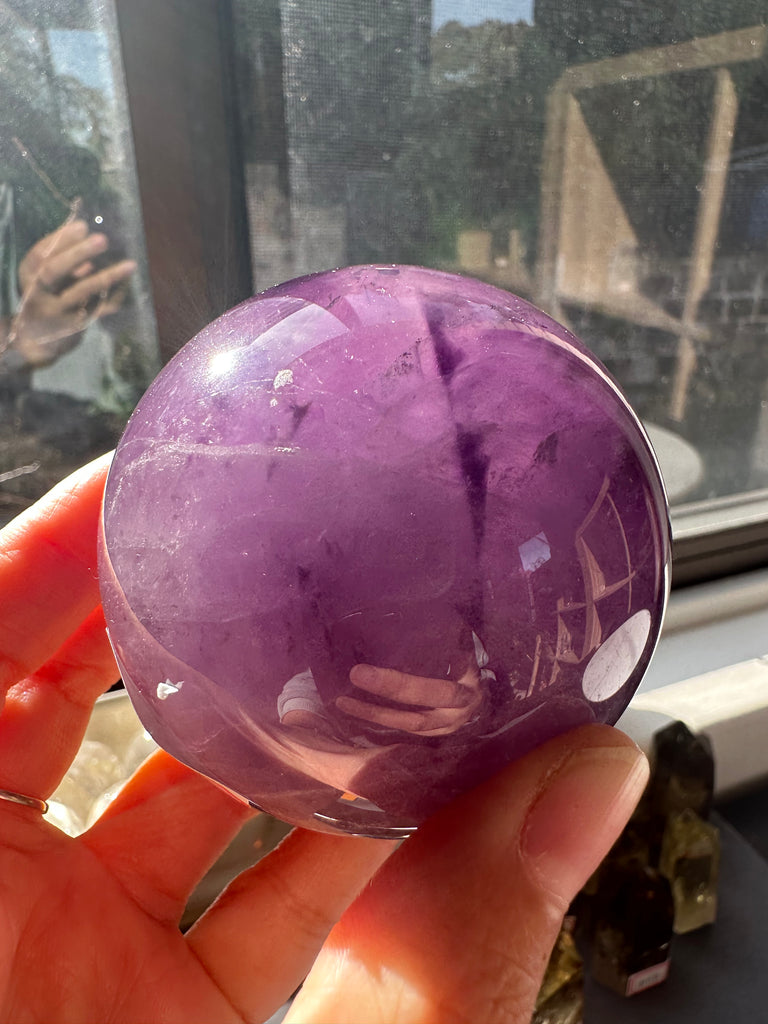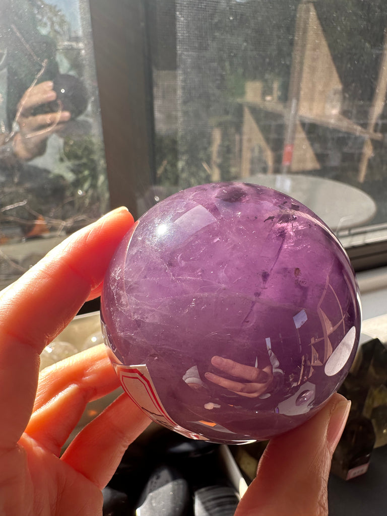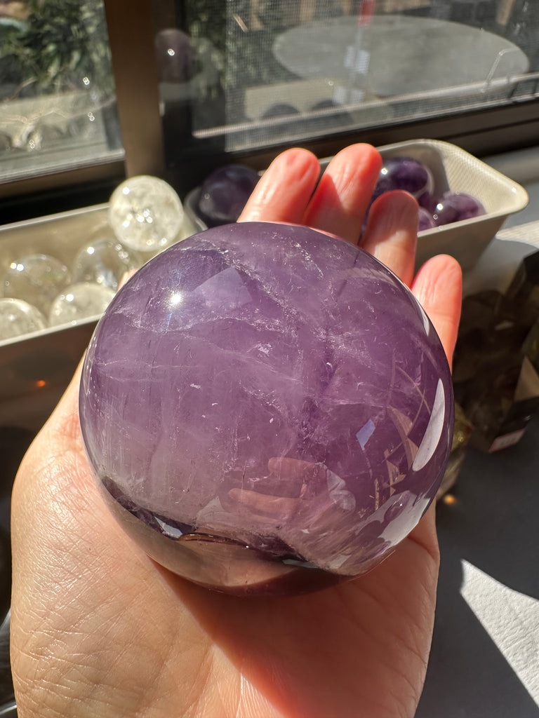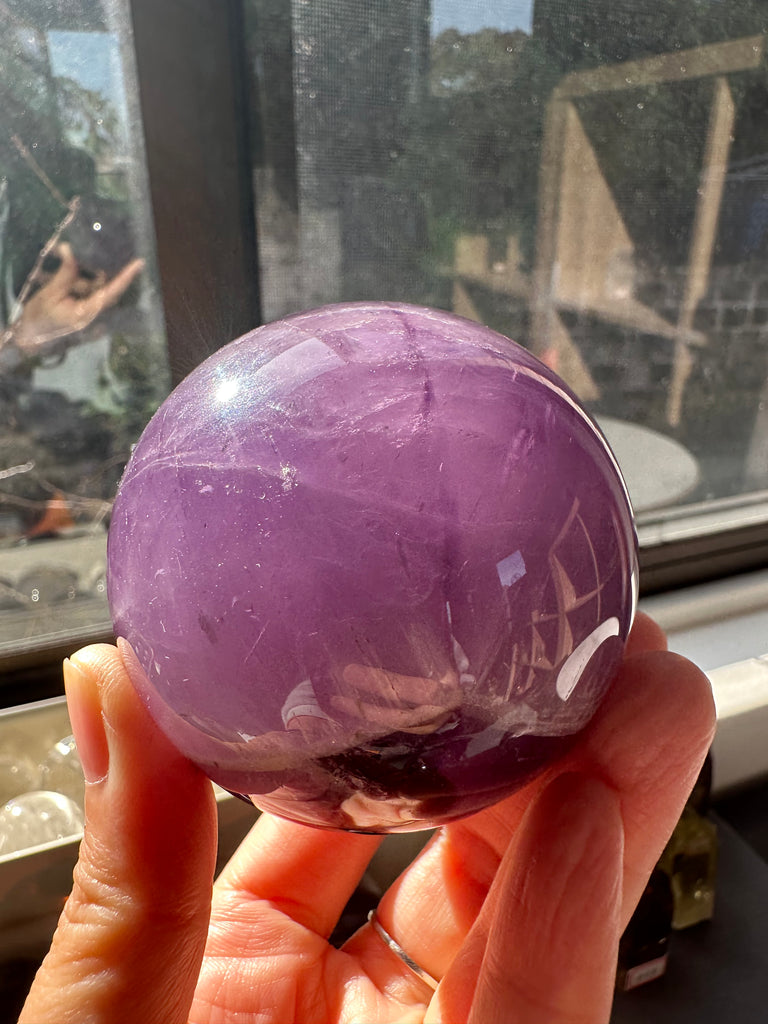 Carved and polished from high-grade natural amethyst, this crystal sphere radiates gentle, protective energy and is perfect for meditation, energy healing, or simply as a centerpiece to elevate any space.