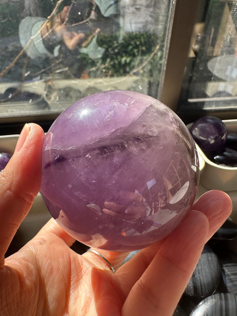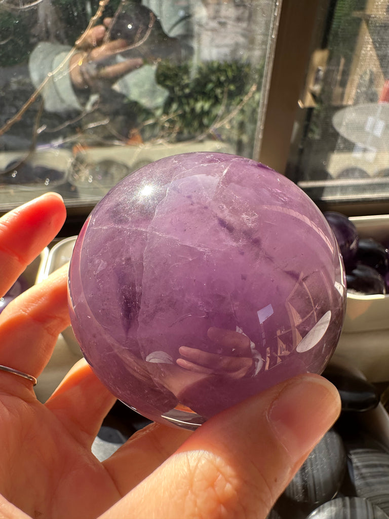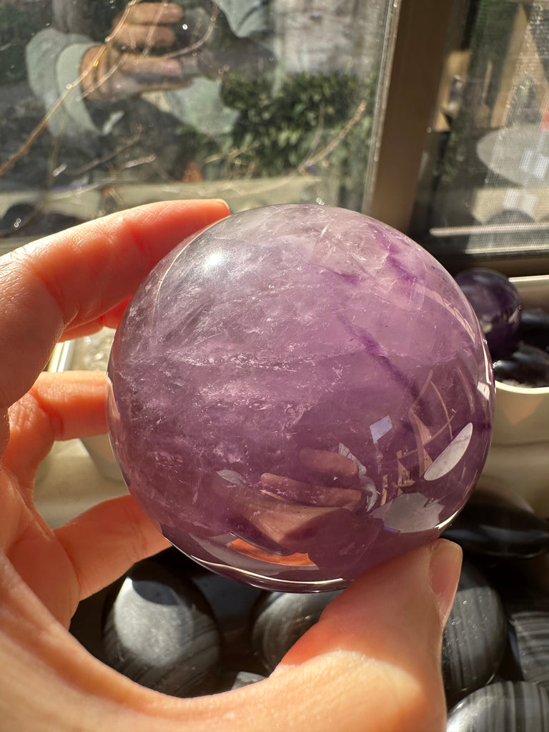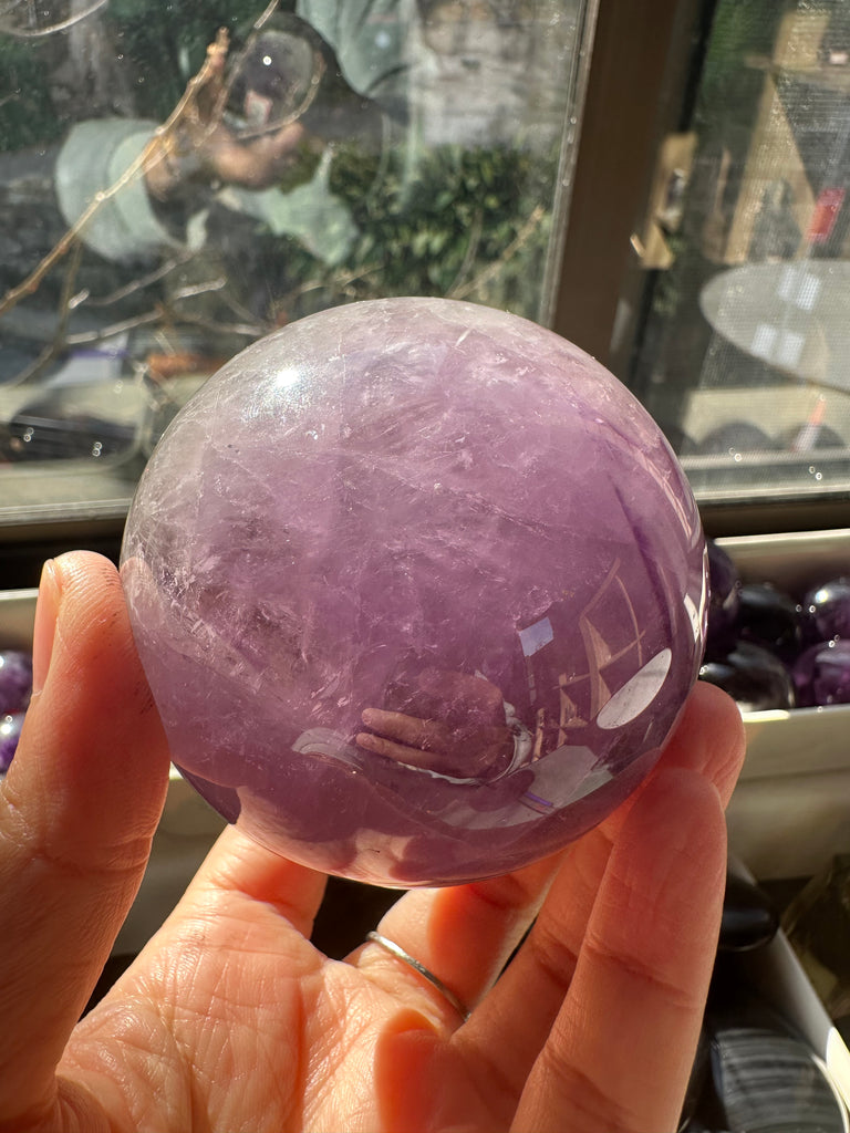 Carved and polished from high-grade natural amethyst, this crystal sphere radiates gentle, protective energy and is perfect for meditation, energy healing, or simply as a centerpiece to elevate any space.