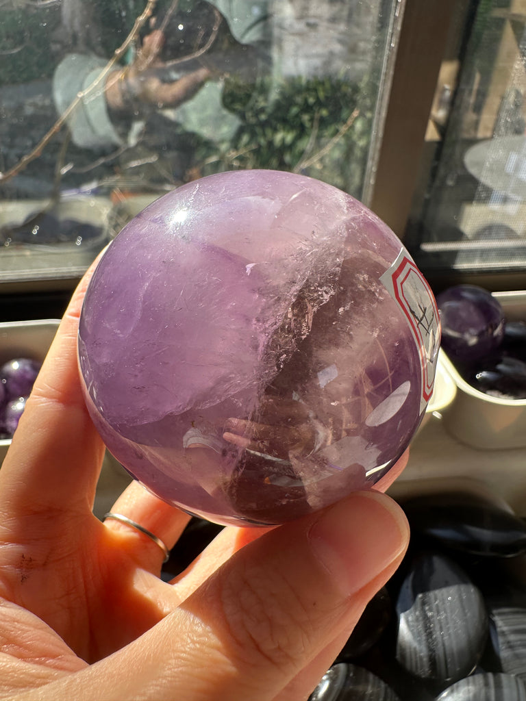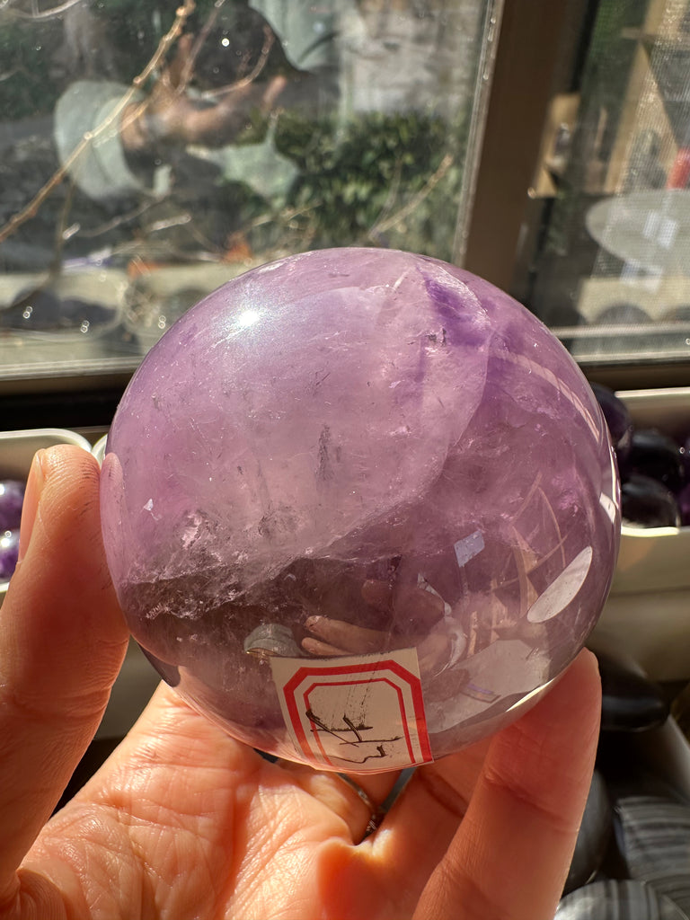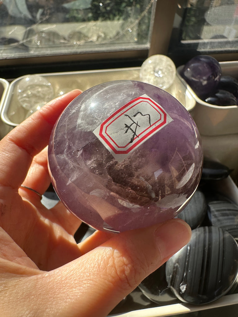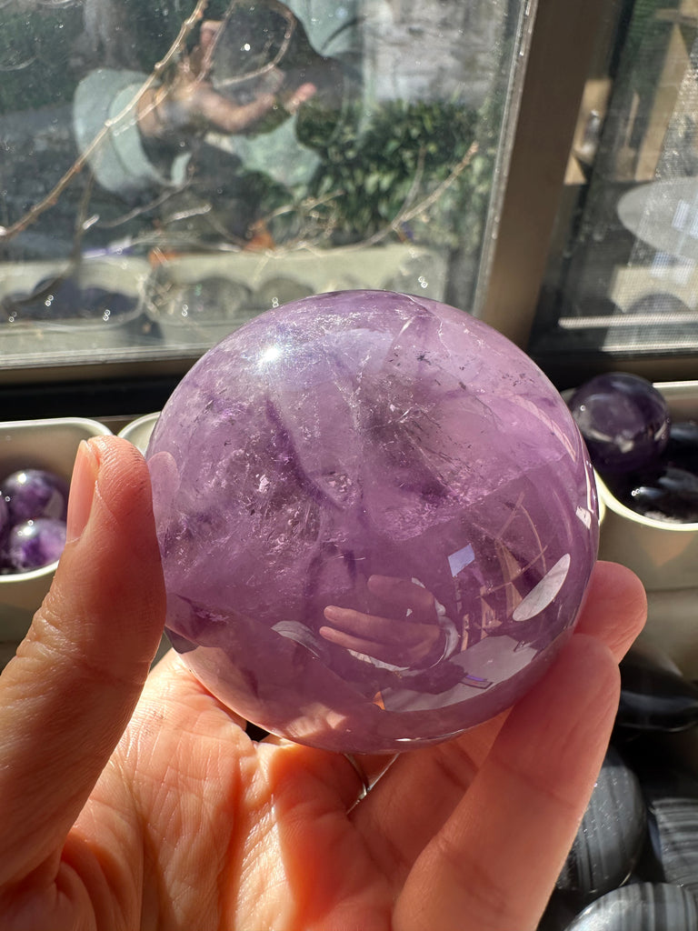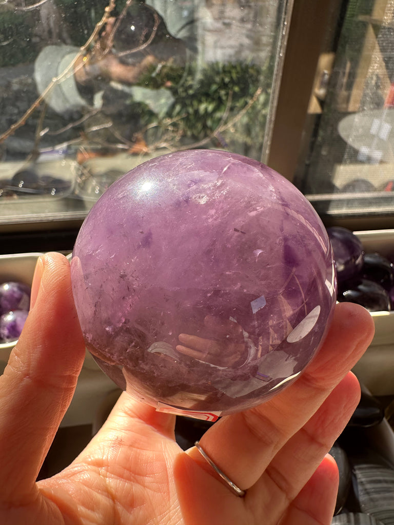 Carved and polished from high-grade natural amethyst, this crystal sphere radiates gentle, protective energy and is perfect for meditation, energy healing, or simply as a centerpiece to elevate any space.