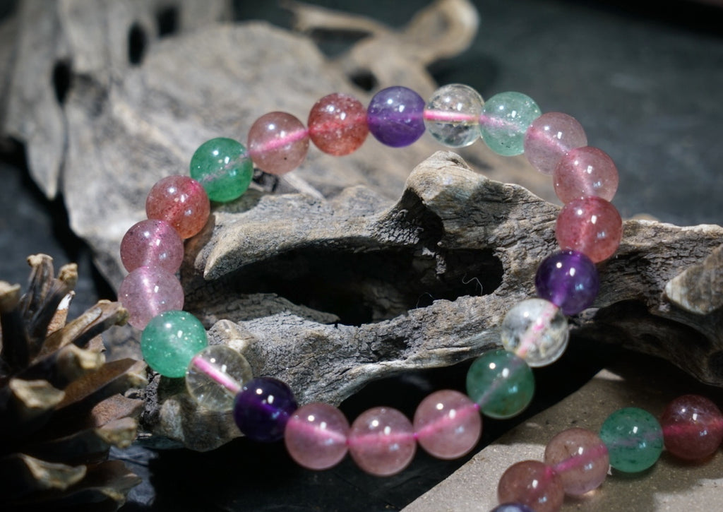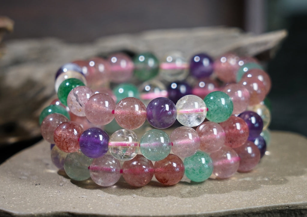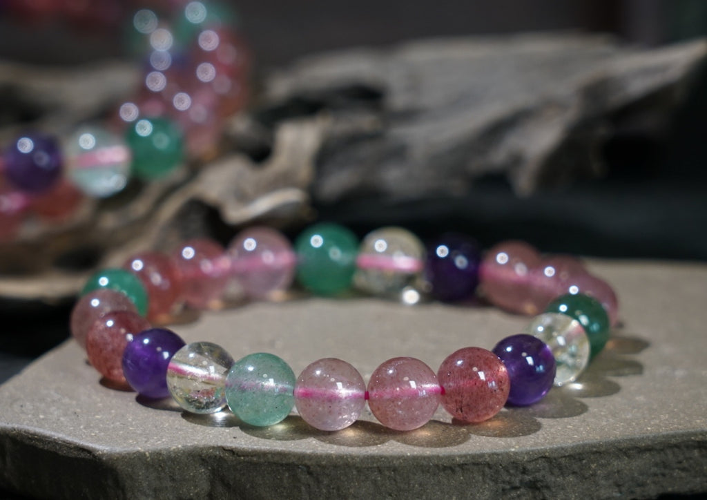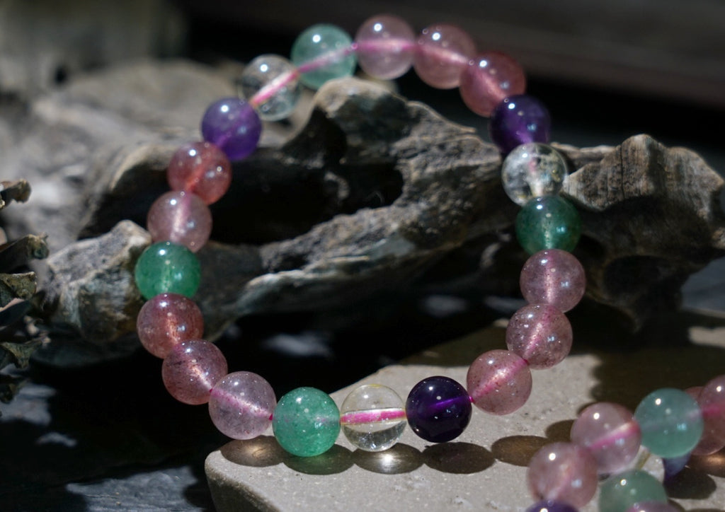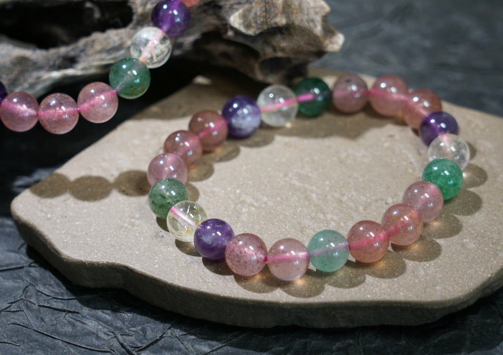 - Material: Natural strawberry quartz, green strawberry quartz, and amethyst beads