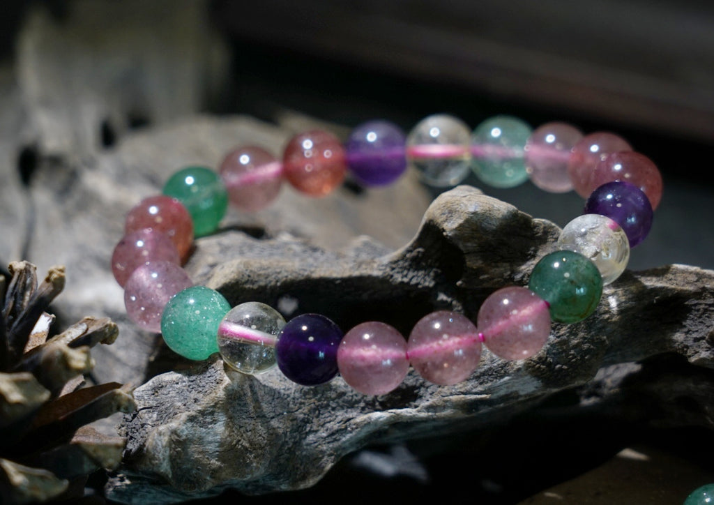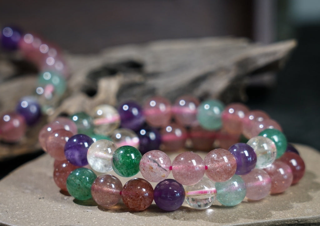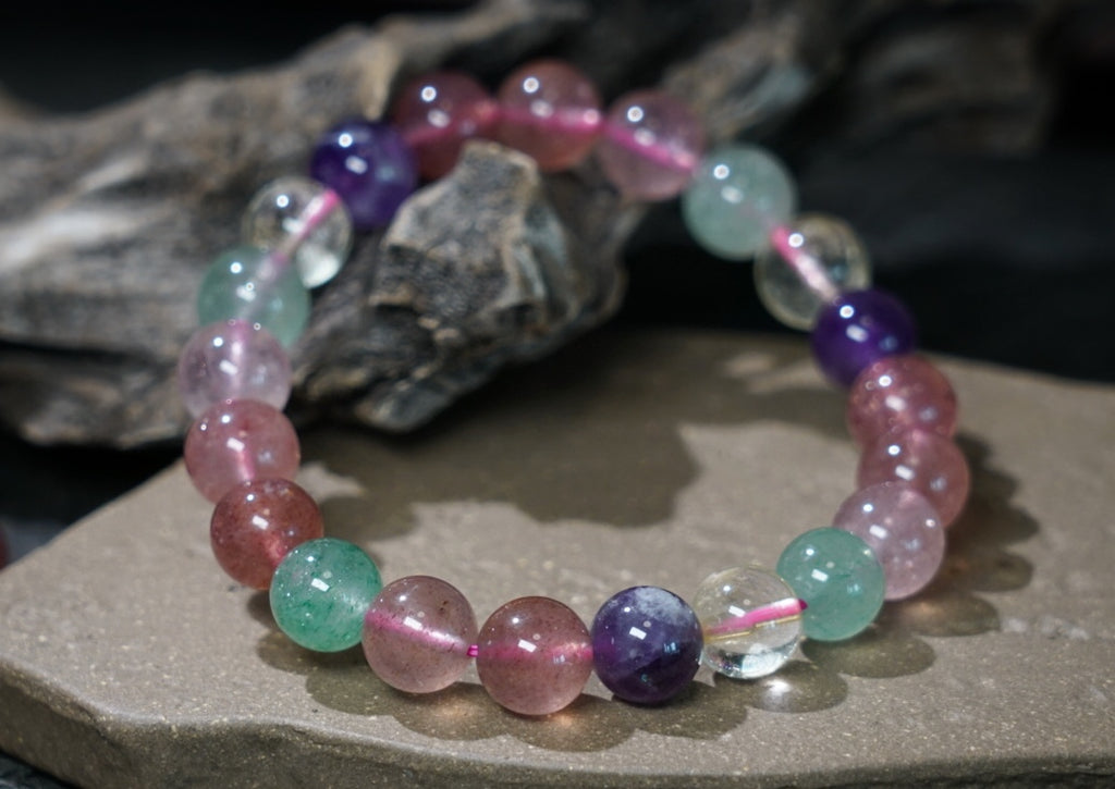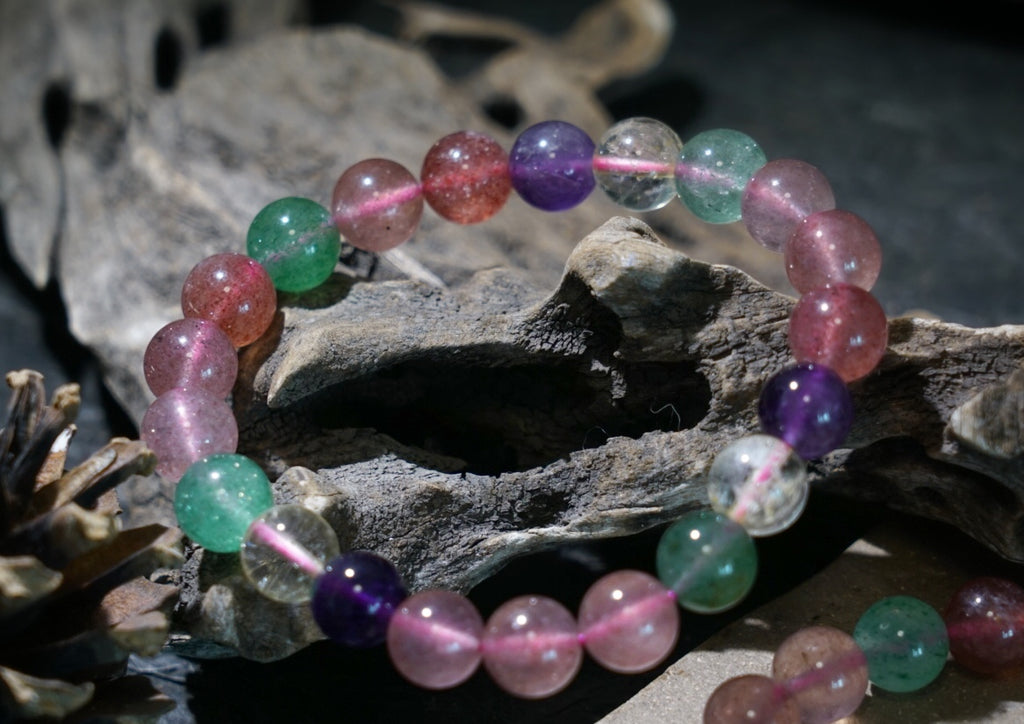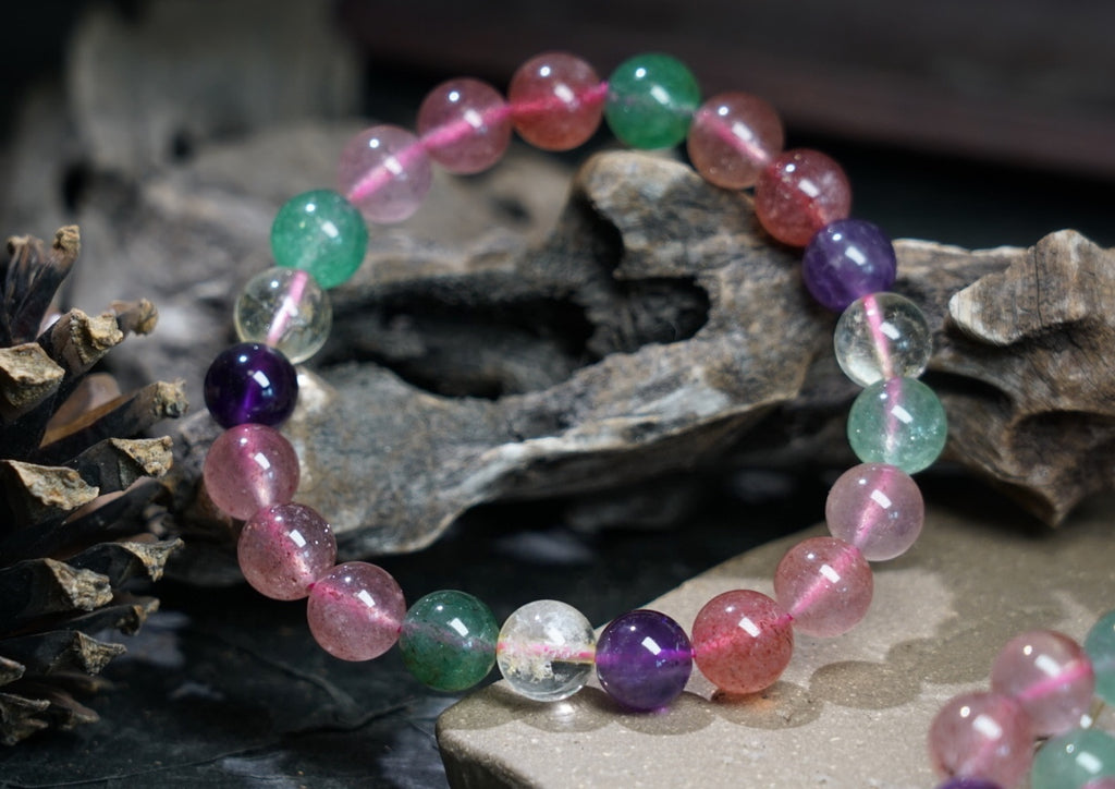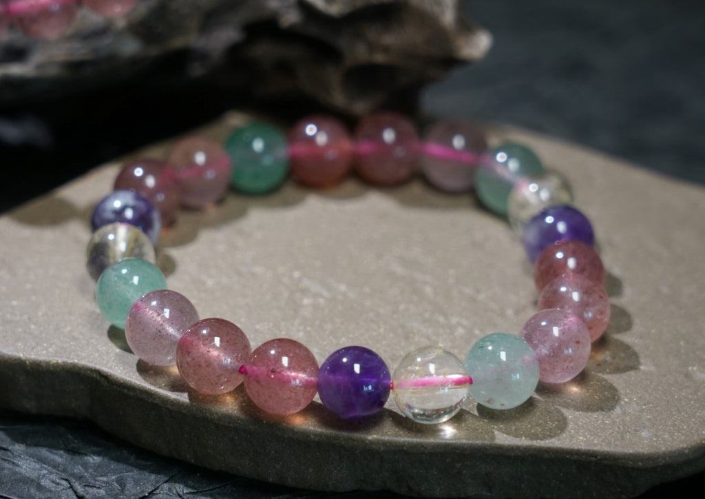 - Material: Natural strawberry quartz, green strawberry quartz, and amethyst beads