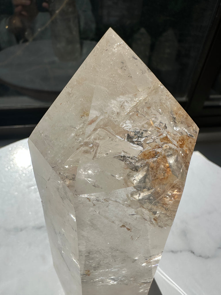 This polished Clear Quartz tower features smooth surfaces and crisp lines that reflect and amplify light. Each tower is a one-of-a-kind natural masterpiece, with subtle variations in clarity and inclusions that make it uniquely yours.