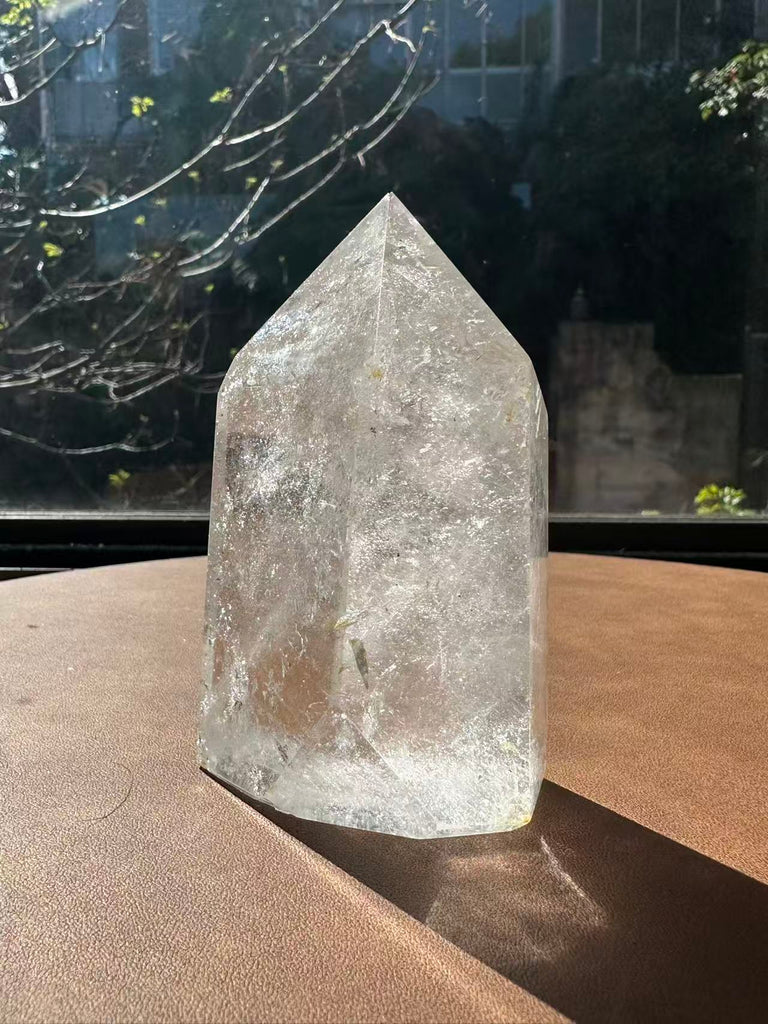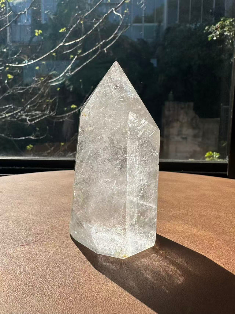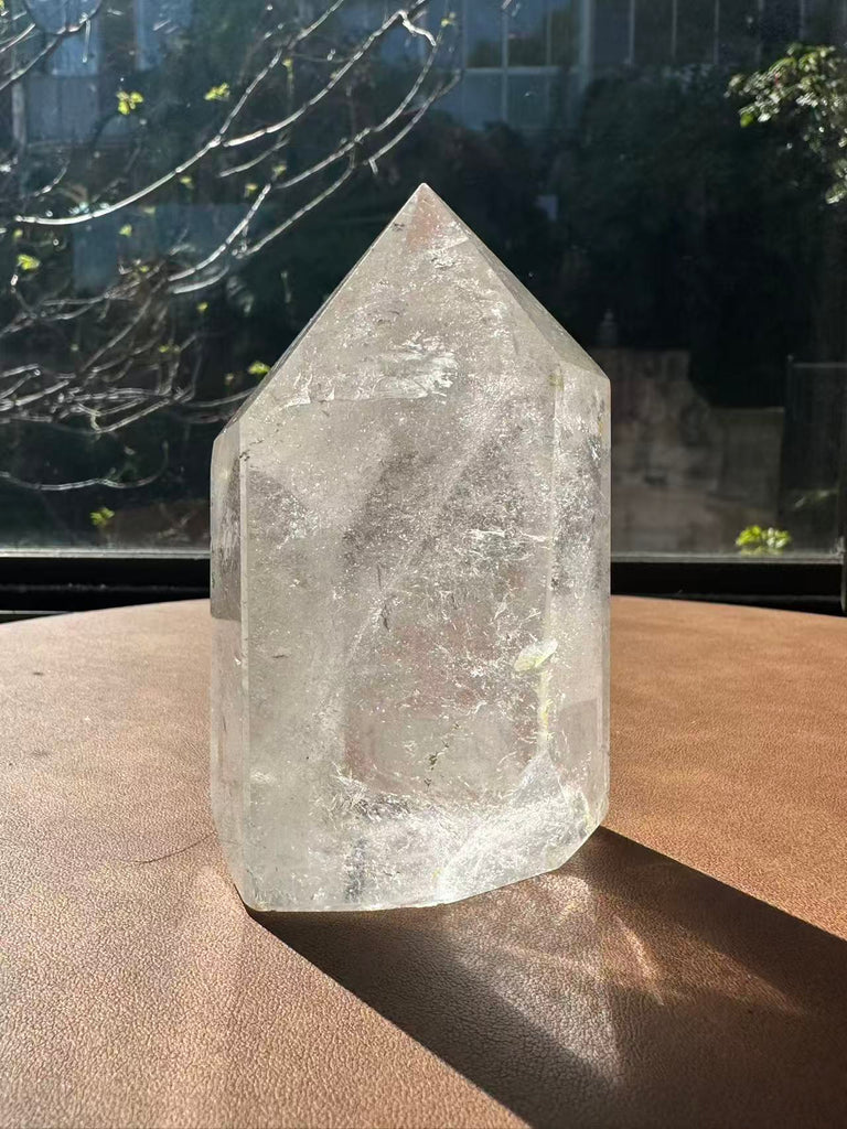 This polished Clear Quartz tower features smooth surfaces and crisp lines that reflect and amplify light. Each tower is a one-of-a-kind natural masterpiece, with subtle variations in clarity and inclusions that make it uniquely yours.