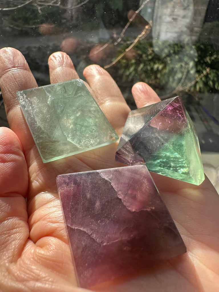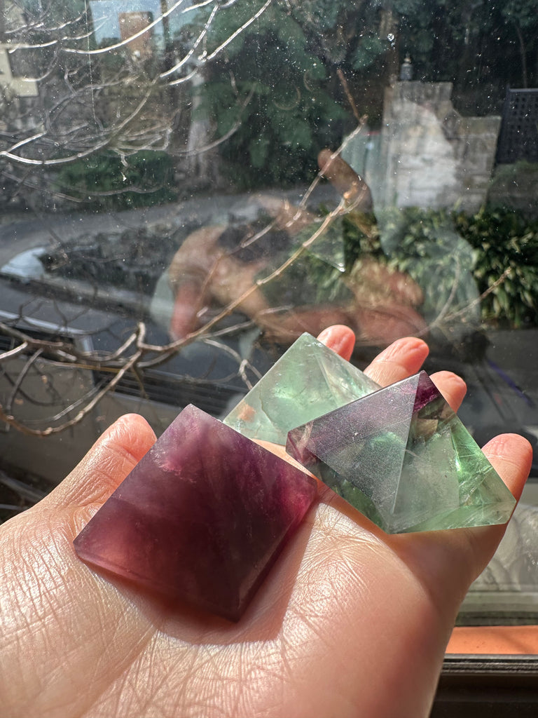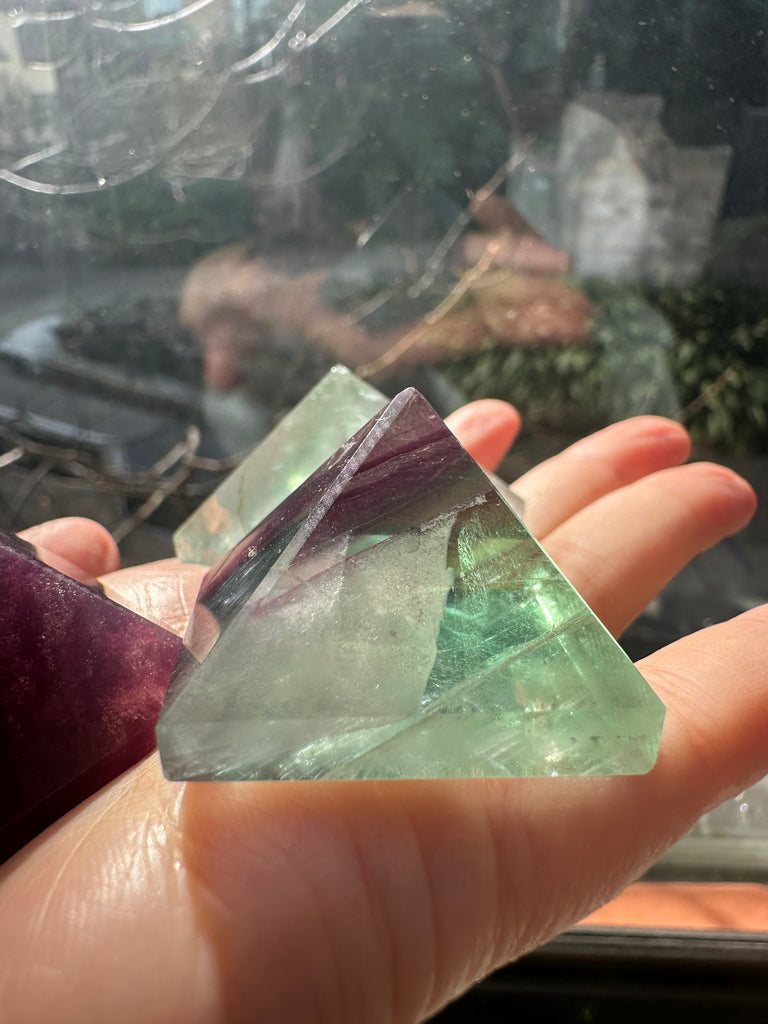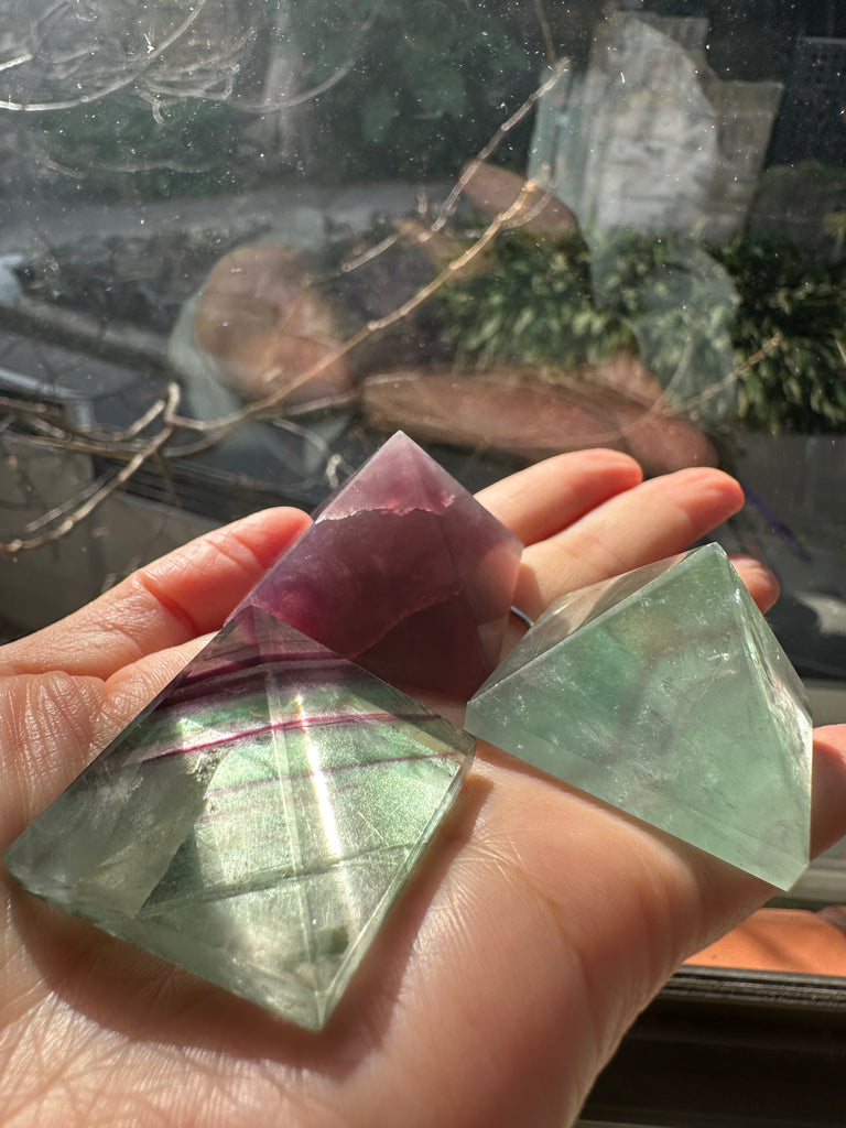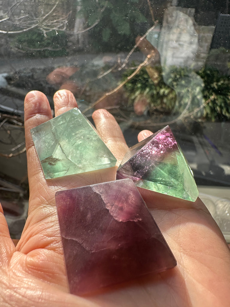 This Rare Curved Fluorite Pyramid is a one-of-a-kind piece that blends geometric symmetry with soft, flowing edges — a rare and beautiful twist on the traditional pyramid shape. Hand-carved from natural rainbow fluorite, it showcases soothing bands of purple, green, and blue, offering both visual harmony and powerful energetic benefits.