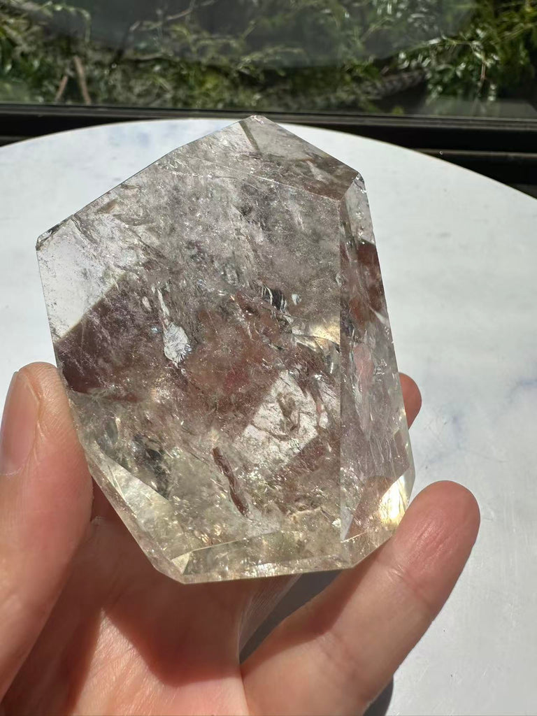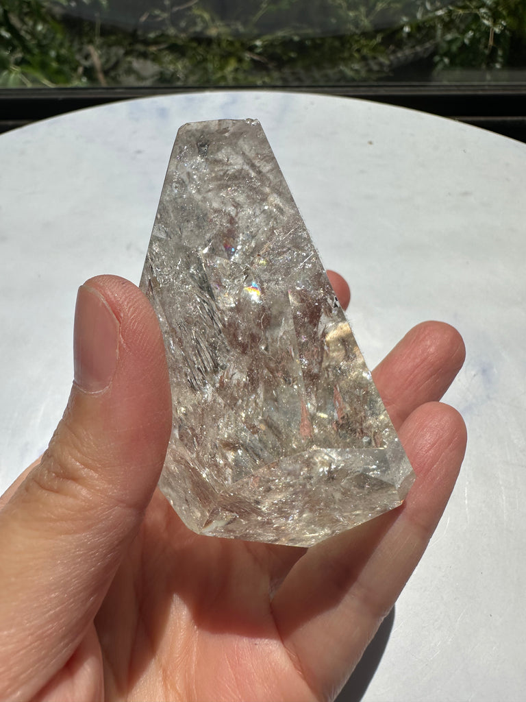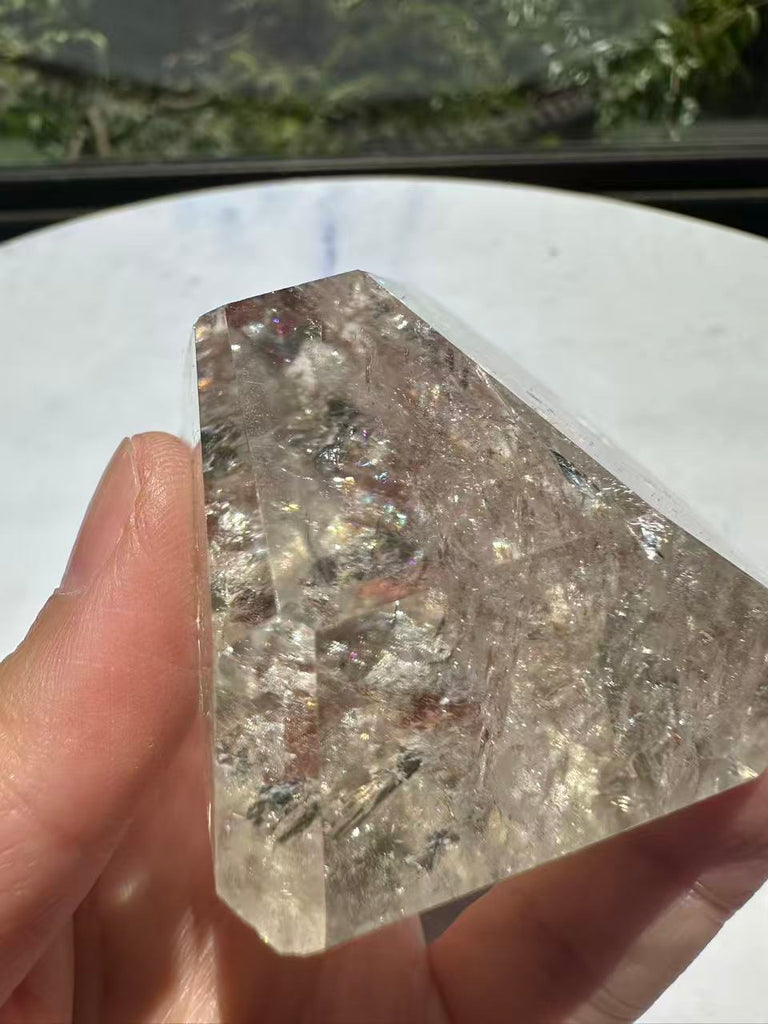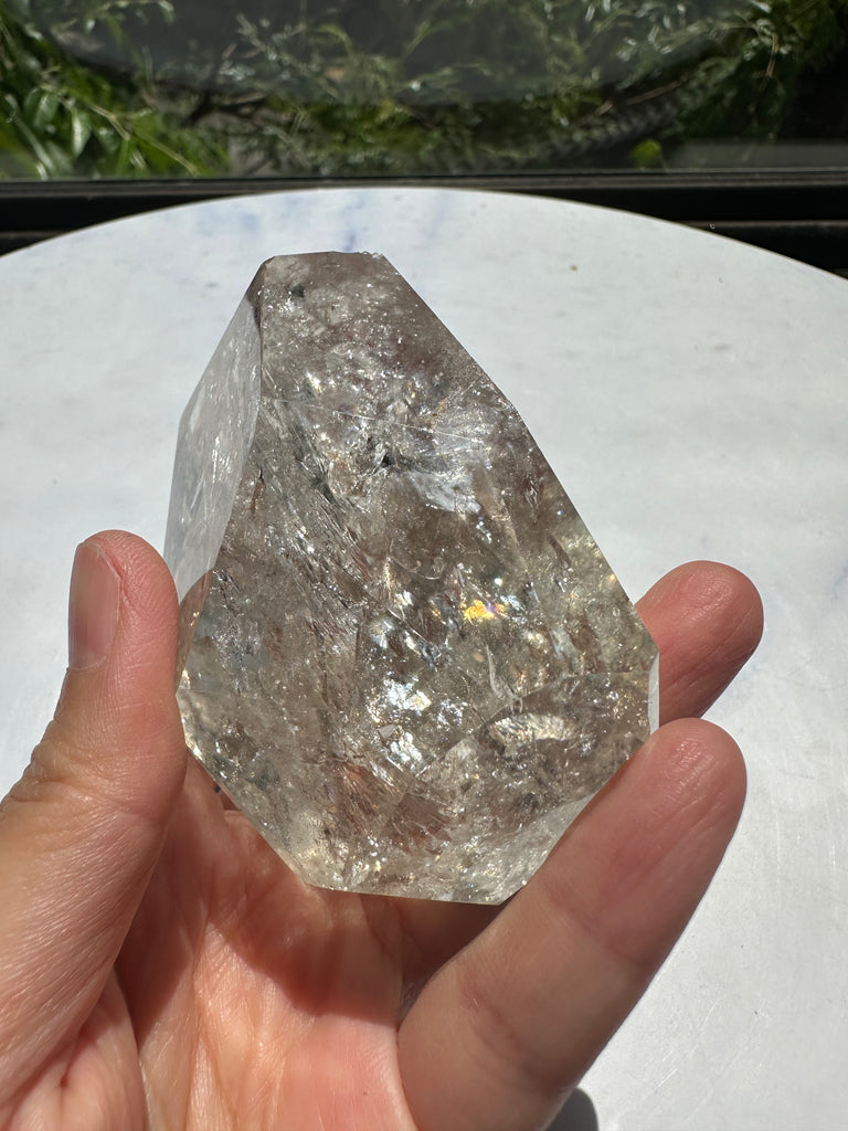 This specific Azeztulite Freeform Tower features Vibrant Rainbow Inclusionsāflashes of iridescent light trapped within the quartz. These rainbows (or "iris") occur when light refracts off internal fissures, symbolizing the pure light and spiritual potential locked within the stone, and magnifying its healing energy.