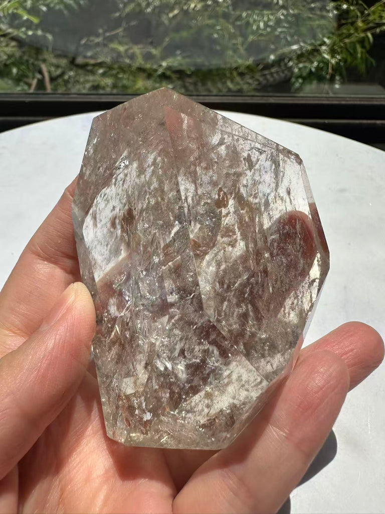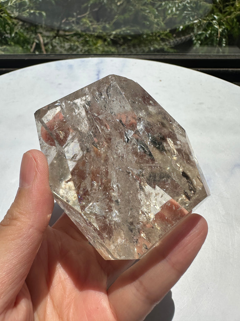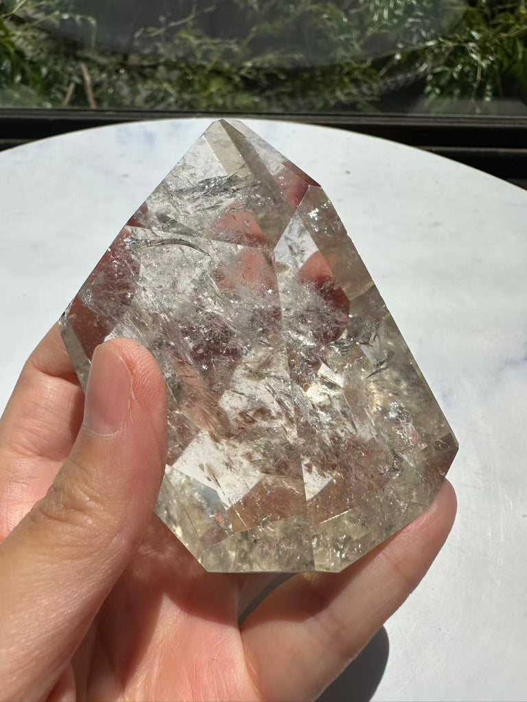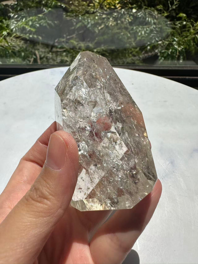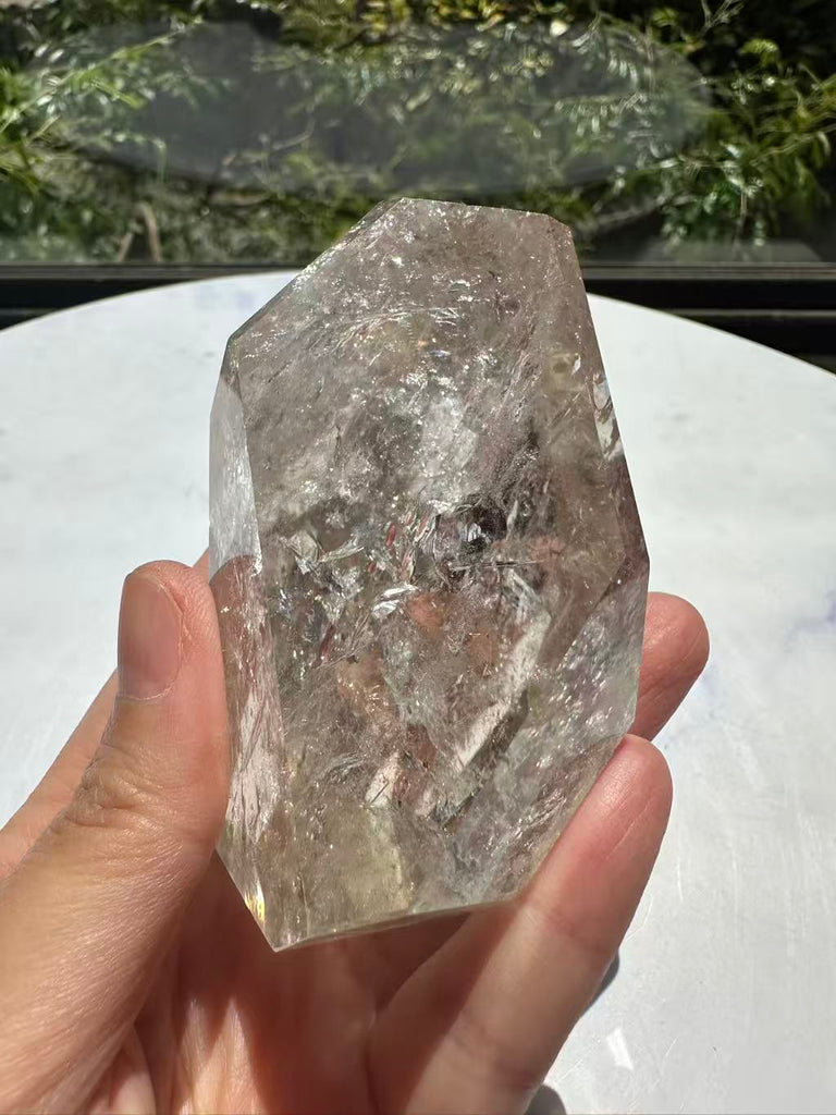 This specific Azeztulite Freeform Tower features Vibrant Rainbow Inclusionsāflashes of iridescent light trapped within the quartz. These rainbows (or "iris") occur when light refracts off internal fissures, symbolizing the pure light and spiritual potential locked within the stone, and magnifying its healing energy.
